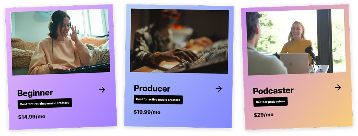 - Producer: Intended for more experienced artists ready to take their skills further. It's designed for creators who have moved beyond the basics and are ready for deeper control, higher-quality results, and a more professional production experience. Subscribers can choose Producer or Producer Plus tiers which include production capabilities such as AI mastering, playable samples, plug-in bundles, an AI instrument stem generator, distribution and promotion services, and more from Output, LANDR and artist promotion platform Groover.