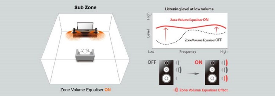 Automatically adjusts bass and treble balance to match the volume on systems in Zone 2. Enjoy movies and music with a natural sound quality balance even at low volumes.
