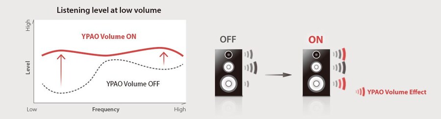 Still hear everything. Human ears have less sensitivity to high and low frequencies, especially at lower volumes. YPAO Volume applies loudness EQ correction to automatically adjust high and low frequency levels as volume changes. Using the YPAO measurement results, EQ correction is optimized to your system settings and listening environment