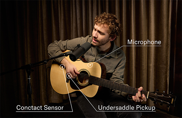 It captures vibrations from the strings using an under-saddle pickup, the resonance of the top board through a contact sensor pickup mounted on the underside of the soundboard, and the character of the guitar body with an internal microphone. By blending these three distinct pickup types, this system recreates delicate nuances and the natural ambiance that conventional pickups often fail to capture. This allows for an optimal setting tailored to each guitar model.