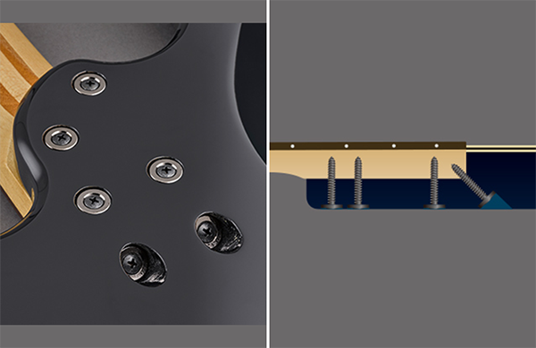 "Miter Bolting" technology was developed during the design process of the Billy Sheehan Signature Attitude Bass. The goal was to create a neck attachment method that could withstand intense neck bending. Through this research, Yamaha reconsidered the traditional bolt-on construction and introduced an innovative solution: in addition to the standard bolt-on method, an extra bolt is installed at a 45-degree angle from the back of the body, securing the neck end more firmly.