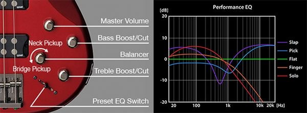 These are five EQ presets (Slap, Pick, Flat, Finger, Solo) that allow players to instantly switch between different tones when performing. With just a simple switch operation, players can easily select the optimal sound for a song or part. The 2-band active EQ provides intuitive control for fine-tuning the tone.