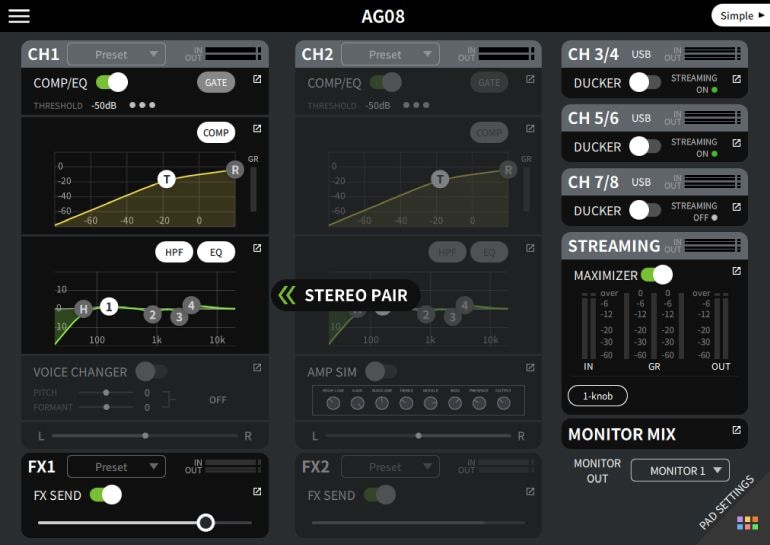 AG08 Controller Version 1.5 adds a new mode for Channels 1 and 2 called “STEREO PAIR.” You can switch it on and off in the STEREO PAIR menu on the “Settings” screen. Enabling this mode will link Channels 1 and 2 as indicated below, making it easier to configure settings. This mode is ideal for recording and streaming band performances and ASMR videos with a left and right stereo microphone.
