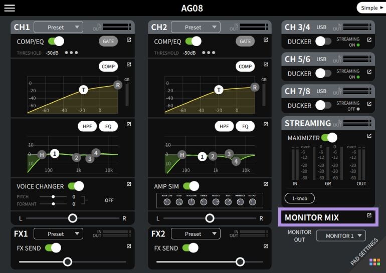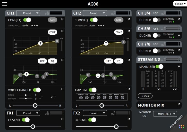 AG08 Controller Channels 1 and 2 have setting presets tailored to different purposes. Select a preset to instantly change COMP/EQ, VOICE CHANGER/AMP SIM, and FX to the recommended settings for each application.
