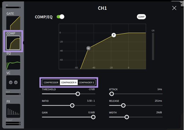 The hard and soft companders combine the effects of the compressor, expander and limiter. The compander can be selected from the COMP Type in the COMP section. Compander expands and compresses sound to reduce unnecessary sounds such as background noise and improve sound quality. This is especially useful in situations where the signal-to-noise ratio (S/N ratio) tends to get worse, such as when increasing the gain for using a low-sensitivity microphone.