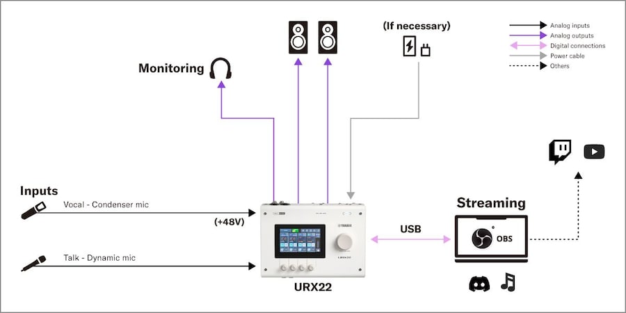 Monitoring is provided through headphones or monitor speakers, while the mixed audio is sent via USB to streaming software such as OBS.