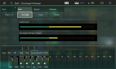 The Envelope Follower converts audio into a control output. This output can control other parameters. For example, a kick drum could be used to “duck” the sound of a bass, creating an effect popularly known as “sidechain compression.”