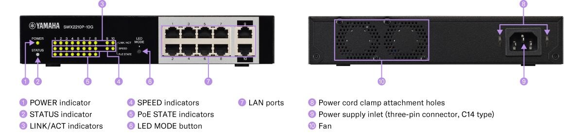 Indicators POWER, microSD, STACK ID, LAN port (LINK/ACT, SPEED), SFP+ port (LINK/ACT, SPEED) POWER, microSD, LAN port (LINK/ACT, SPEED), SFP port (LINK/ACT, SPEED) POWER, LAN port (LINK/ACT, SPEED), PoE STATE POWER, PoE LIMIT, LINK/ACT, SPEED, PoE STATE (x31)
